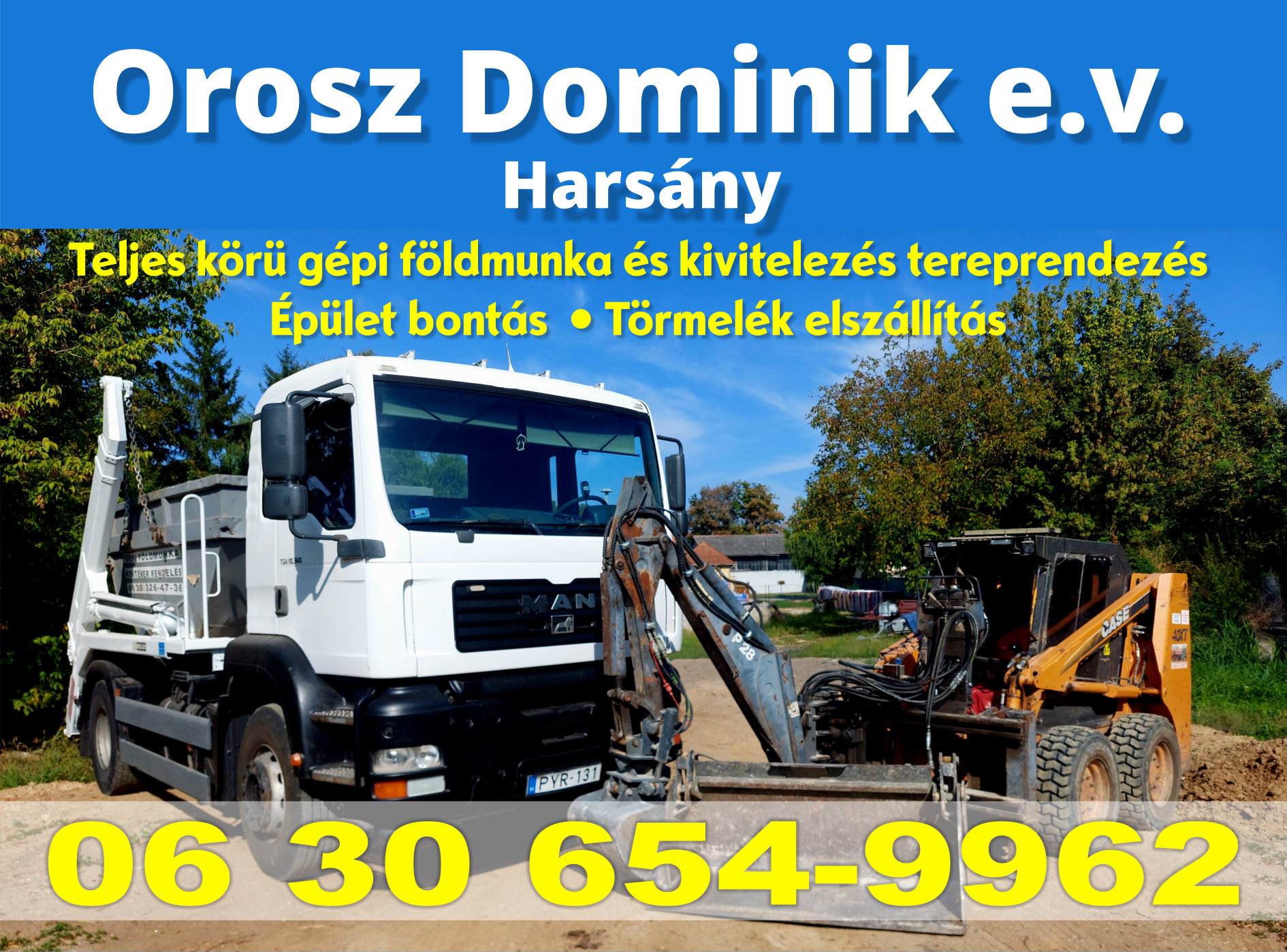 Orosz Dominik egyéni vállalkozó vagyok ! 5 éve foglalkozom gépi földmunkával, Rendelkezem egy MAN típusú teherautóval, amivel a rakodógépet szállítom a helyszínre. A rakodógéphez a homlok kanálon kívül elérhető ásó berendezés 30,40,60,100 cm széles kanalakkal, igény esetén raklap villával is. Így széles körű több funkciós munkát is el tudok végezni. Rugalmas, precíz munkavégzés jellemző rám, melyet referencia munkákkal is alá tudok támasztani.